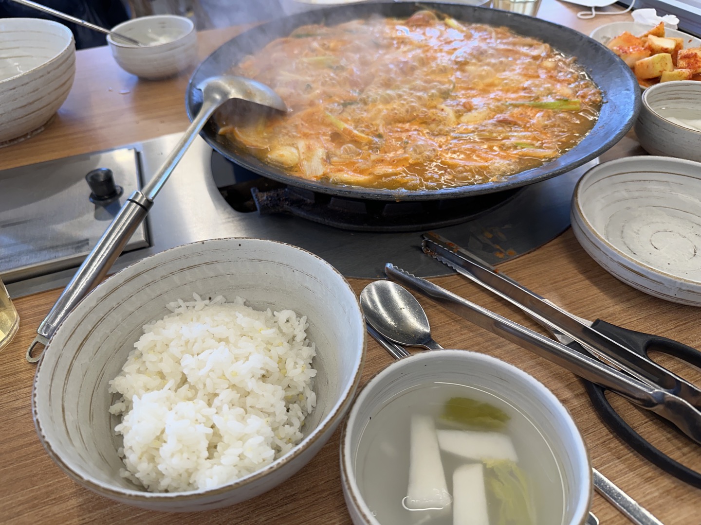 항상 부대찌개가 나오고, 끓기 전까지는 동치미를 먹어줘야 해요.